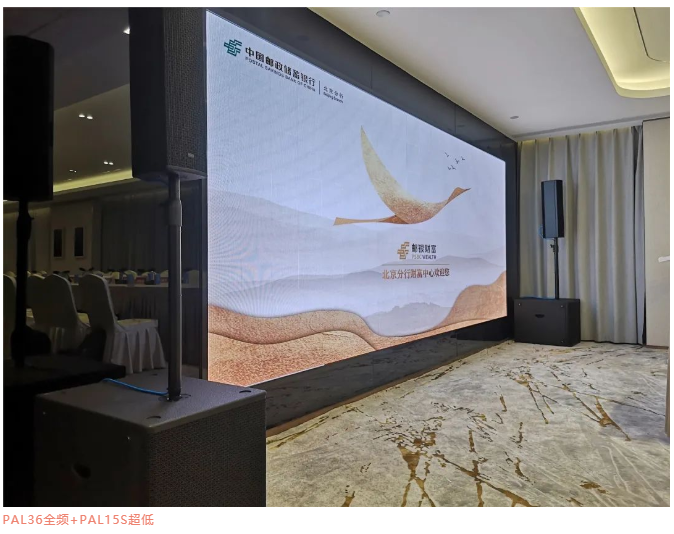 從大會議室的整體環境出發,以兩組“PAL36全頻+PAL15S超低”組合支架安裝擔當主擴聲音箱。PAL系列線性陣列音柱,音色和美感兼備,它獨特的空間擴散技術,使發出的聲波能向遠處和兩邊擴散,而非上下方向傳播,讓細膩之聲充盈全場。