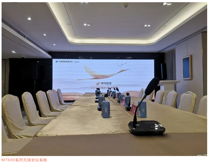 考慮這里日常舉行會議所需,配備了一套MT600系列無線會議系統,由系統主機MT600WZ、主席單元MT680WC、客席單元MT680WD組成,具備討論發言、視像跟蹤等功能,無線連接的安裝方式,方便、整潔又美觀,加上自帶的液晶顯示屏,可實時提示人員操作步驟。