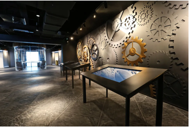 二層為鐘表文化體驗(yàn)展廳,該展廳由五個(gè)部分組成:臨展區(qū):預(yù)留投影面、展柜位等空間,滿足臨時(shí)主題展覽靈動(dòng)可變的展示需求。多媒體互動(dòng)區(qū):通過(guò)聲光電一體化的多媒體系統(tǒng)介紹腕表的歷史與設(shè)計(jì)演變。手表材料與機(jī)芯展示區(qū):通過(guò)空間沉浸式造景設(shè)計(jì)對(duì)手表機(jī)芯及手表不同結(jié)構(gòu)材料進(jìn)行展示。機(jī)械互動(dòng)體驗(yàn)區(qū):通過(guò)空間造景和多媒體展示,打造虛實(shí)結(jié)合的體驗(yàn)場(chǎng)景來(lái)介紹手表機(jī)械裝置和工藝。手作體驗(yàn)區(qū):手表拼裝體驗(yàn)。