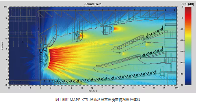 當(dāng)獲得足夠的場地信息之后,需要利用揚聲器廠家提供的模擬軟件(或者通過Ease Focus這種基于GLL文件的通用設(shè)計軟件)進(jìn)行建模,這些軟件可在可視化的條件下,實時調(diào)整并計算不同設(shè)計方案的覆蓋均勻度以及聲壓級分布,較為復(fù)雜的模擬軟件(如Ease)甚至可以將反射和墻面材質(zhì)的吸聲特性都考慮在內(nèi),實現(xiàn)對反射情況的模擬(見圖1)。系統(tǒng)建模和預(yù)測的重要作用在于讓系統(tǒng)工程師在裝臺開始之前就能夠做好全部的計劃和準(zhǔn)備工作,進(jìn)而起到減少正式施工時長并提高工作效率的作用。