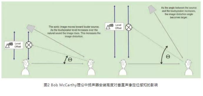 任何解決方案都存在一定的局限性。這些局限性主要來自于劇場的尺寸、舞臺的結(jié)構(gòu)、觀眾席座位的分布以及劇場的聲學(xué)環(huán)境等要素。使用中置揚聲器對于那些舞臺鏡框特別高的場地可能不是一個好的選擇。吊掛的高度決定了聲源發(fā)出的位置(見圖2),若揚聲器與觀眾席垂直方向的夾角大于30°,位于前排的觀眾就有可能會感覺到垂直方向上的聲像漂移,產(chǎn)生人聲或?qū)Π讈碜灶^頂而非前方的感覺。此時,設(shè)計時可以考慮通過臺唇補聲系統(tǒng)來覆蓋前排觀眾席,中置系統(tǒng)從3排或4排之后的區(qū)域開始覆蓋。