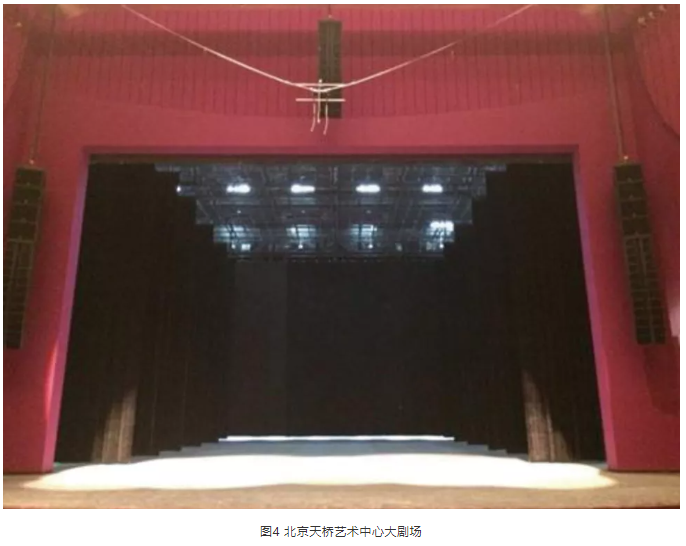 標(biāo)準(zhǔn)劇場中,中置揚聲器組的安裝通常分為暗裝和明裝兩種。暗裝一般是安裝在舞臺鏡框上沿預(yù)留的聲橋當(dāng)中,如北京天橋劇場(圖3)。明裝則是吊掛在舞臺燈桿或預(yù)留的吊點上,如北京天橋藝術(shù)中心大劇場(圖4)。暗裝對觀眾的視覺影響最小,如果劇場擴(kuò)聲系統(tǒng)設(shè)計合理,建筑聲學(xué)指標(biāo)達(dá)標(biāo),且在鏡框高度不是很高的情況下,劇場中置聲道暗裝是最好的安裝方式。但是國內(nèi)劇場的實際情況并不樂觀,且不同演出的系統(tǒng)工程師和音響設(shè)計師都有各自的設(shè)計和考量,暗裝中置聲道位置又基本不可調(diào)整,所以很多劇場中暗裝的中置聲道使用率很低。明裝的中置聲道更便于安裝、拆卸以及調(diào)整,更加適合流動性強的演出,因此,越來越多的現(xiàn)代化劇場采用這種安裝方式。