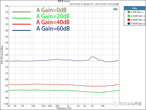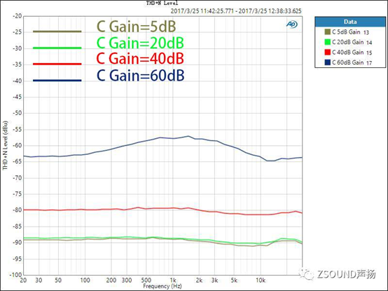 對于數字調音臺,我們不僅要關心話放增益在0dB時的THD+N比率,還需要了解到,話放增益在不同位置時的情況,因為這是使用中的實際情形。話放的增益在不同大小時,其引入的噪音和失真也是不同的,了解這一點對于用戶正確設置增益也很有參考意義。