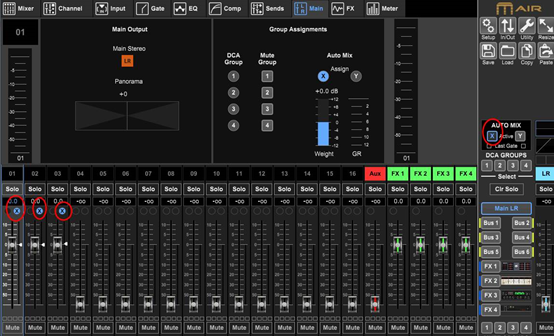 下面我給前三個(gè)通道編到X組,這里要注意的是,在給每個(gè)通道分完組之后,要記得把總的AUTO MIX的開(kāi)關(guān)打開(kāi),如圖紅圈所示。