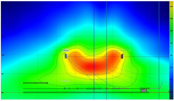 以下兩個系統(tǒng)仿真圖模擬了10顆雙10寸線陣列揚聲器在同一個劇場中對三層觀眾席最后一排的覆蓋情況(為了便于觀察,陣列被設(shè)置在了劇場的中軸線上)。第一張圖是陣列吊掛高度為15米,基本與第三層最后一排觀眾席持平,陣列物理姿態(tài)調(diào)整至如圖狀態(tài)后能夠在三層最后一排得到令人滿意的覆蓋。