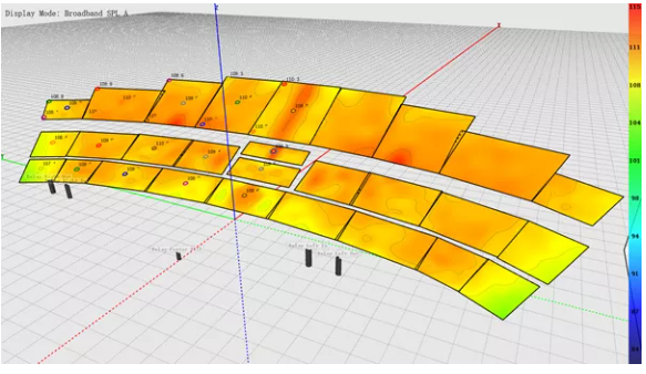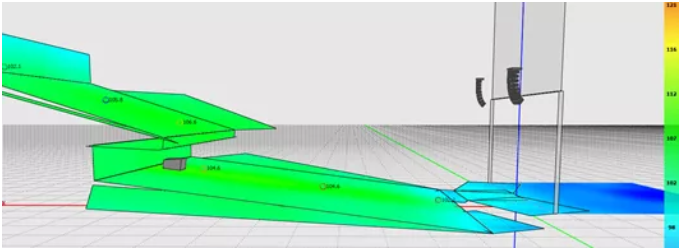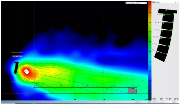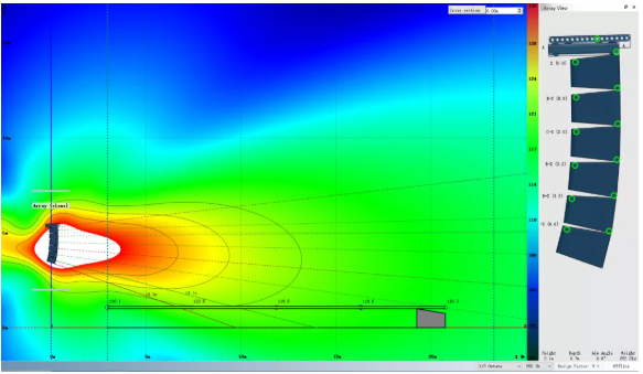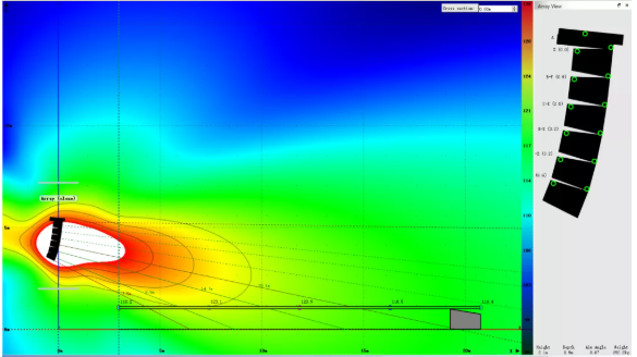 我們可以看到,為了獲得較為滿意的覆蓋結(jié)果,傳統(tǒng)線陣列在吊點高度不足時必須以接近極限的物理姿態(tài)來進(jìn)行安裝。請注意最上面2顆音箱的快插銷已經(jīng)出現(xiàn)了載荷警報,呈現(xiàn)紅色。在實際項目中如果遇到此類情況,就不得不在吊裝位置和覆蓋效果之間做出妥協(xié)。