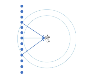 如圖,左邊一列圓點為換能器陣列,兩個圓以聽音者為圓心,它們的半徑差對應(yīng)著被考察頻率的1/3波長,離聽音者最近的換能器到達(dá)時間最短,越靠陣列兩端,到達(dá)聽音者的時間越慢。當(dāng)?shù)竭_(dá)時間晚于1/3波長時,我們認(rèn)為換能器在這個頻率上對聽音點沒有貢獻(xiàn)。