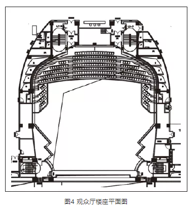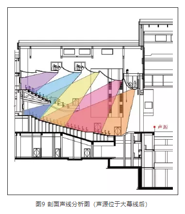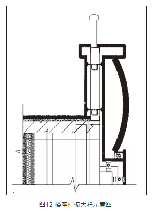 樓座欄板應避免垂直面,做吸聲或擴散處理。根據觀眾廳混響時間控制,以及結合內裝裝飾效果,在欄板部分做弧形擴散處理,大樣示意見圖12。