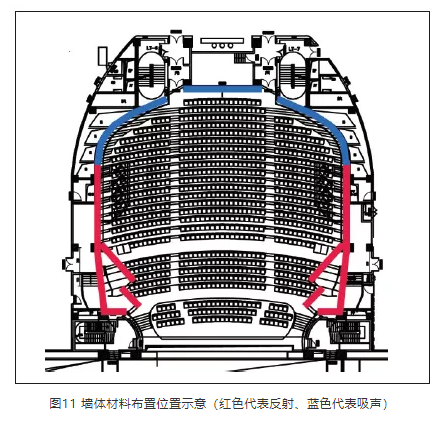 根據確定的混響時間值,對主劇場觀眾廳進行聲學材料布置,同時遵循室內聲學材料布置原則,確定觀眾廳空間以下部位的材料及構造做法。
