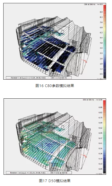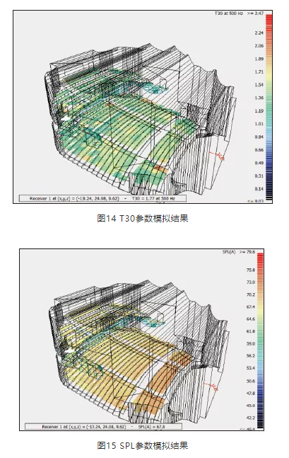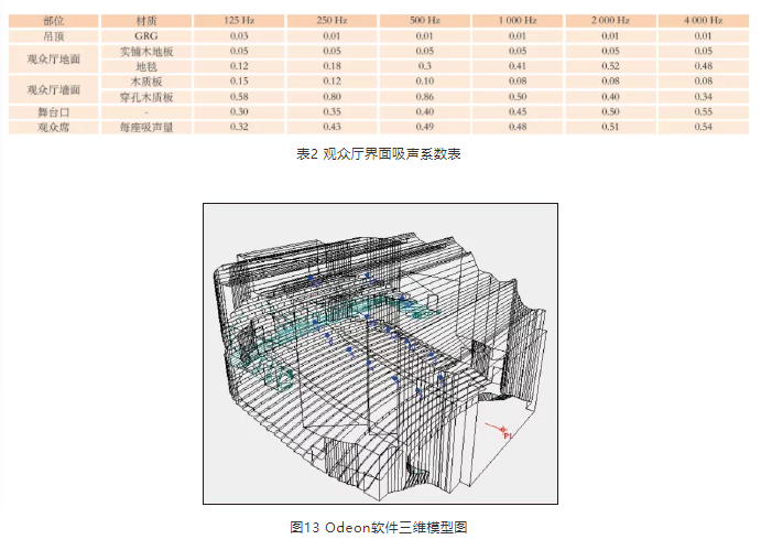 混響時間設計完成后, 采用Odeon軟件對聲場環境進行模擬,對方案起到一定的校正作用。觀眾廳各部位吸聲系數見表2,圖13為模擬軟件中三維模型圖,圖14~圖18為各參數的模擬結果,表3為各測點平均值。