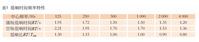 語言清晰度是評價廳堂語言聲是否清晰的參數,所有倍頻程測量結果均大于0.3,略小于要求的≥0.45,可能是由于空場環境缺少觀眾吸聲造成的。