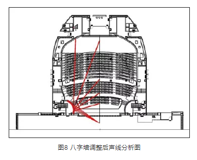 觀眾廳剖面設計取決于兩個因素。一是規范規定的每座容積,它能確定觀眾廳吊頂的大概高度;二是觀眾廳剖面聲線分析,它能確定吊頂的最終形式。結合上述兩個因素,最終確定的吊頂形式如圖9、圖10所示??梢钥闯?,經吊頂反射的聲音能覆蓋觀眾席的所有區域,其分布均勻,能達到良好的聲場效果。