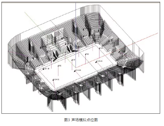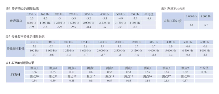 施工完畢后,進行了現(xiàn)場實測,測點如圖10所示。經現(xiàn)場測試,擴聲系統(tǒng)聲壓級可基本達到設計值,其他測量結果見圖11、表2—表4。測試結果反映,該項目達到設計目標及行業(yè)相關標準指標。