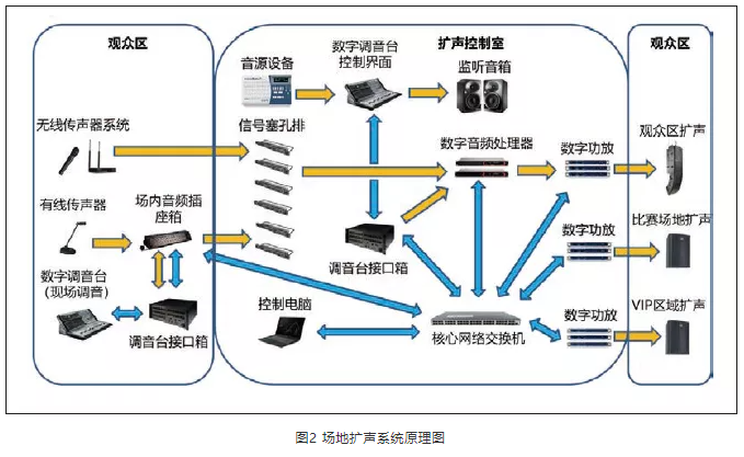 擴聲系統(tǒng)的總體改造方案,系統(tǒng)的音頻控制、傳輸通過Dante網絡構建數(shù)字加模擬的混合網,場館內所有音頻信號均匯聚到音頻控制機房進行分發(fā)。數(shù)字調音臺同樣采用一主一備,主調音臺可搬至場內進行現(xiàn)場調控,并在主席臺區(qū)預留音頻接口箱,可接入有線傳聲器、無線傳聲器系統(tǒng)。系統(tǒng)使用時,需要根據(jù)不同賽事的使用場景對數(shù)字調音臺以及功率放大器進行預設。系統(tǒng)基本框架如圖2所示。
