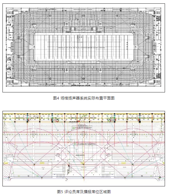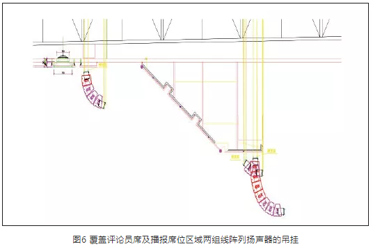 對于聲場的設計,揚聲器系統(tǒng)既考慮主席臺區(qū)的覆蓋,又要考慮整個觀眾區(qū)的覆蓋;在揚聲器選型上,要符合重量要輕、體積小、聲壓大等性能,以滿足承重、避免建聲缺陷、提高語言清晰度、避讓視頻照明等其他設備等一系列的相關要求。通過仿真軟件NS-1模擬設計,確定揚聲器數(shù)量、吊掛高度、投射角度等,以達到體育建筑設計規(guī)范一級指標,聲壓級為105 dB,語音清晰度指數(shù)不小于0.5,聲場模擬點位如圖3所示。不同的區(qū)域根據(jù)實際的面積、縱深覆蓋需求,對線陣列揚聲器的數(shù)量、分頻、吊掛角度與高度進行配置。主擴聲揚聲器系統(tǒng)采用14組雙12英寸三分頻無源全頻線陣列揚聲器,吊掛覆蓋整個觀眾區(qū)。其中,北側方向共分8組,每組根據(jù)覆蓋區(qū)域分別由2~8只揚聲器單元組成;東西方向各1組,每組4只揚聲器單元;南側方向共分4組,每組根據(jù)覆蓋區(qū)域分別由4~8只揚聲器單元組成。揚聲器布置平面圖如圖4所示。以評論員席以及播報席區(qū)域為例,由于區(qū)域觀眾席第一排至最后一排的高差為15 m,如圖5所示,因此使用了2組線陣列揚聲器進行覆蓋,分別使用了4只、7只揚聲器單元,其吊掛角度、高度分別為-7°、20.5 m,-2°、17.9 m,如圖6所示。