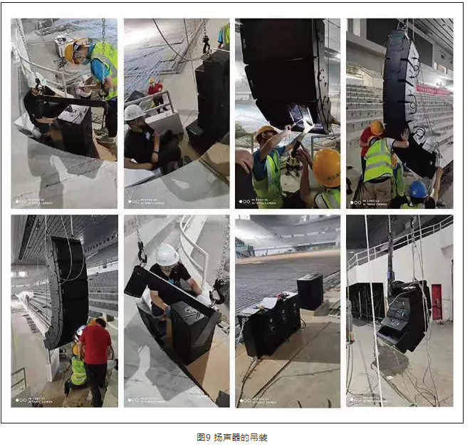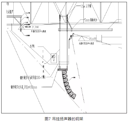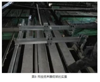 在揚聲器系統(tǒng)吊掛過程中,由于首都體育館保留了原有大頂球型網架結構、馬道,在球型網架的結構下還有鋁板造型結構以及龍骨,而揚聲器系統(tǒng)的吊掛點位于大廳頂層鋁板之上,需要穿過結構下懸桿、鋁板和鋁板固定龍骨層,避開燈光線路以及馬道,并且每一組線陣列揚聲器的安裝位置不相同,需要精確的定位,以滿足現(xiàn)場覆蓋的范圍及角度。基于這種情況,在進行了實地勘察測量后,經各方討論,最后選擇了單獨設計安裝鋼結構吊點的吊掛方式。根據(jù)現(xiàn)場不同的位置,定制吊掛揚聲器的鋼架,如圖7、圖8、圖9所示,吊掛高度可以在鋼架上調整。這一結構不僅可以避開場地照明光路等,還可以應對施工過程中馬道等一些設施的更改。