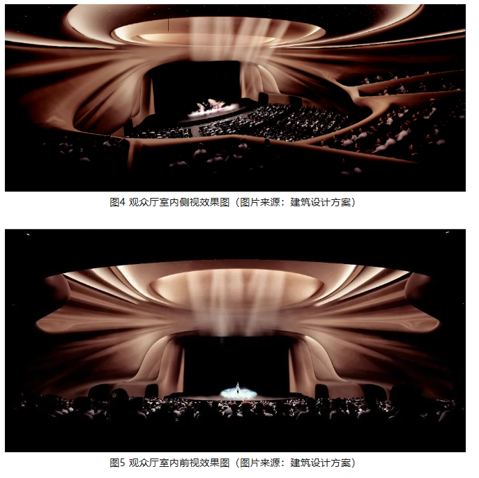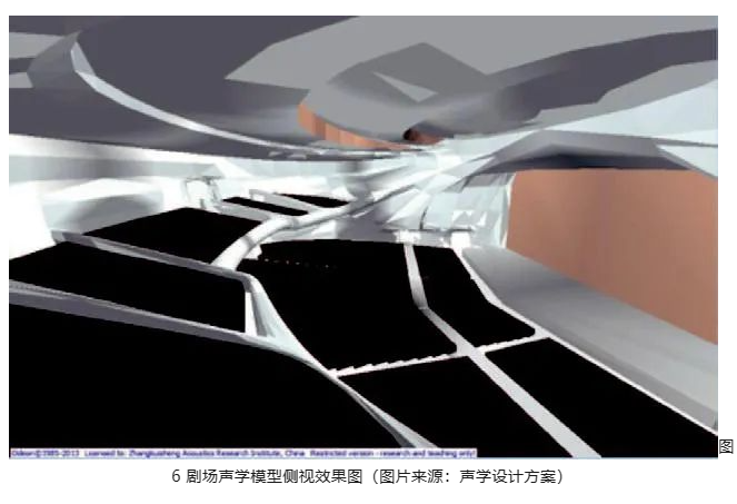 體型設計是建聲設計的基礎,因為反射聲的方向和能量分布主要依賴于墻面及頂面的體型設計。但作為以擴聲演出為主的廳堂,演出時聲音主要來源于揚聲器系統,因此,建聲設計在體型設計方面主要是在滿足室內視覺效果的同時避免各種聲學缺陷的產生。圖4和圖5分別為建筑設計師提供的不同視角的原創室內效果圖。