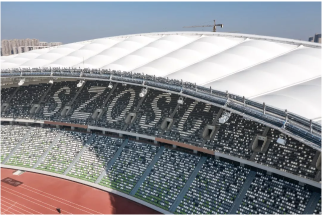 蘇州奧林匹克體育中心體育場是迄今為止中國第一座馬鞍形單層索膜結(jié)構(gòu)屋頂設(shè)計的體育場,通常則為鋼架結(jié)構(gòu),這一次的特殊結(jié)構(gòu)意味著只能借助全場40個索頭拉住膜。