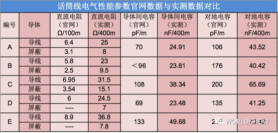 表2:五款線材的電氣性能參數(shù)官網(wǎng)與實(shí)測(cè)數(shù)據(jù)對(duì)比,注意單位的區(qū)別。