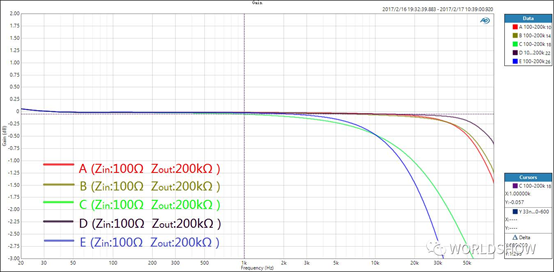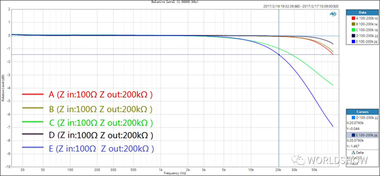 通過以上兩幅測(cè)試對(duì)比,我們基本可以了解專業(yè)音頻系統(tǒng)中話筒線對(duì)信號(hào)傳輸質(zhì)量的影響,主要表現(xiàn)在高頻的衰減上。而對(duì)于非專業(yè)設(shè)備、輸出阻抗設(shè)計(jì)不合理或被錯(cuò)誤設(shè)置到很高的情況下,會(huì)發(fā)生怎樣的改變?
