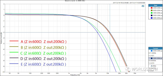 圖中可以看到,輸出阻抗為600Ω時(shí),所有五款線材在音頻范圍內(nèi)都有明顯的衰減,傳輸線路的幅頻響應(yīng)看上去像是專門設(shè)計(jì)的低通濾波器了。表現(xiàn)最好的是D號(hào)線,其截止頻率為11.3 kHz,最差的是E號(hào)線,截止頻率在5.4 kHz。這樣的高頻衰減,在實(shí)際的系統(tǒng)中當(dāng)然是決不允許的。好在這種情況在高品質(zhì)的專業(yè)級(jí)音頻設(shè)備中通常不會(huì)發(fā)生,這些設(shè)備通常有設(shè)計(jì)合理的輸出阻抗。