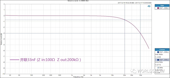 圖3:0.5m信號(hào)線,在卡儂頭2腳(熱端)和3腳(冷端)并聯(lián)一個(gè)33nF電容的幅頻響應(yīng)。