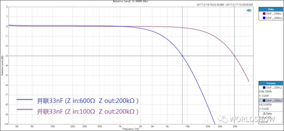 Zin=200 kΩ,Zout=100Ω與600Ω的對(duì)比。