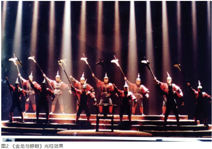 例如,在征戰這場戲中,選用16臺par燈,放在舞臺后區,根據打擊樂的節奏,借助煙霧,與演員動作緊密結合之后,在空間形成16道光柱,以寫意和抽象的方式表達征戰的勝利(圖2)。現在看來,16臺par燈,太少了。但在那個年代,整場演出用燈超過60臺,就算是大制作。如果16臺par燈僅用一次,作為特殊效果燈而存在,那不是太少,而是太多了。一方面,由于當時條件受限,每一臺燈都需要爬大約8 m高梯子對光,非常危險;另一方面,燈光設計具有繪畫能力、造型能力,每一組燈都是在特定場景中布置的特殊效果燈,都是為了某個特定場景而存在,所以每一臺燈或每一組燈,都有非常明確的使用目的。筆者這代人在燈光設計過程中,受到的是特殊效果燈的訓練。如果要使特殊效果燈起作用,必須精讀文本,且要在排練場看彩排,深入了解導演所有的場面調度和處理。只有這樣,燈光設計才能做到心中有數,才敢用一個燈投射下去,并把規定情境的思想情感與形式美感表達出來。