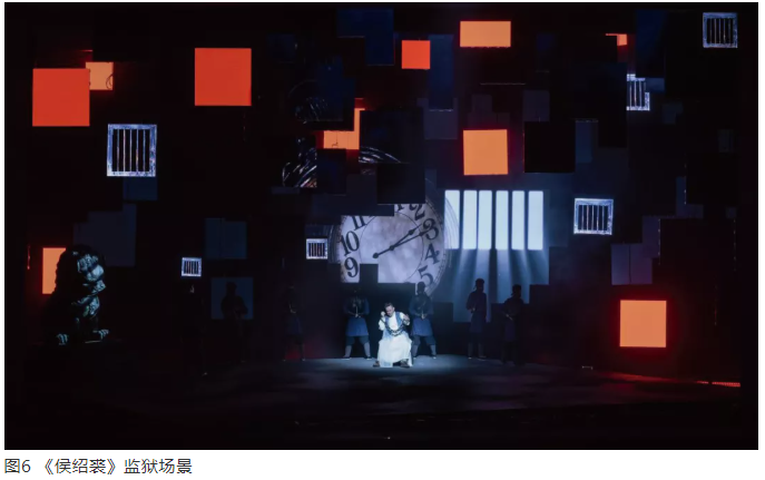 比如,劇中監獄窗格透出的光束形象是屏幕形象,而不是燈光光影形象(圖6)。它是一種光景,借助多媒體手段創造的環境形象。在這個屏幕形象呈現過程中,舞臺燈光也創造與其相一致的光影效果,通過視覺錯視,使平面和立體效果產生關系,進而形成渾然一體的戲劇動作空間。多媒體的形象和燈光的形象是一體的,而且多媒體形象作為一個完整的形象,視覺效果特別奪目,在信息傳遞上又特別有效。對于當代的燈光設計,多熟悉多媒體技術和手段,是很有價值的。現代戲劇有一個顯著的特征,不是手段匱乏,而是手段太多。在戲劇空間中,如何節制地運用技術手段,是當代舞臺空間演出中一個特別值得思考的話題。