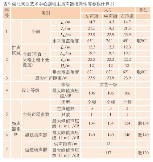 湖北戲曲藝術(shù)中心劇場擴(kuò)聲主揚(yáng)聲器聲線圖如圖7所示。依據(jù)上述理論設(shè)計(jì)揚(yáng)聲器系統(tǒng),計(jì)算過程及結(jié)果如表3所示,包括揚(yáng)聲器的垂直方向角、水平方向角和最大聲壓級等參數(shù)的選取。