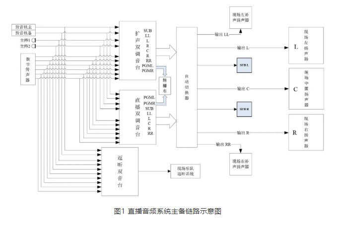對于綜藝節(jié)目的音頻系統(tǒng),現(xiàn)場擴聲系統(tǒng)與播出系統(tǒng)的前級十分類似,主要涉及輸入信號和調音臺的備份,而現(xiàn)場擴聲系統(tǒng)在后級設備的備份上較為復雜,通常會將主備調音臺系統(tǒng)的輸出信號在功率放大器或揚聲器處進行切換。