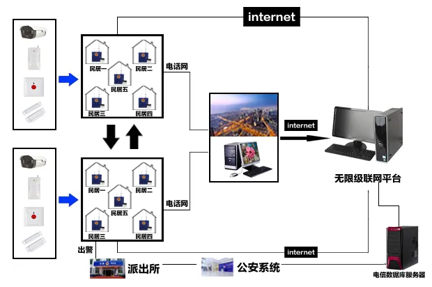 周邊防范:來訪者通過別墅門口機(jī)呼叫,業(yè)主確認(rèn)后開門,其他非法入侵都會(huì)引起警報(bào)(別墅門口機(jī)和大門紅外對(duì)射關(guān)聯(lián),開鎖后撤防,上鎖后,自動(dòng)布防)。