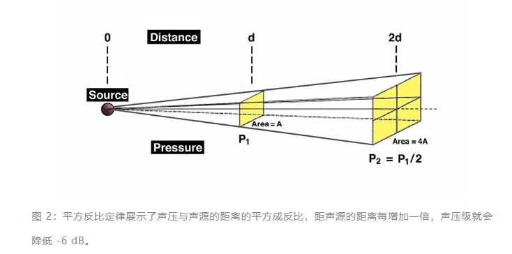 平方反比定律告訴我們,如果沒有回聲或混響,距聲源的距離每增加一倍,聲壓就會出現 6 dB 的下降。如圖 2 所示,假設我們在某個參考距離“d”處測量連續音頻源的聲壓級并檢測 SPL 值 p1。現在,如果我們移動到兩倍“d”的距離,我們將檢測到一個新的壓力值 p2,它將是 p1 的二分之一。這個過程可以無限期地進行,距離每增加一倍,聲壓就會減半。