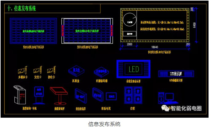 信息發布系統弱電設計圖標主要有LED屏,LCD屏,發送卡,接收卡,音箱等組成。