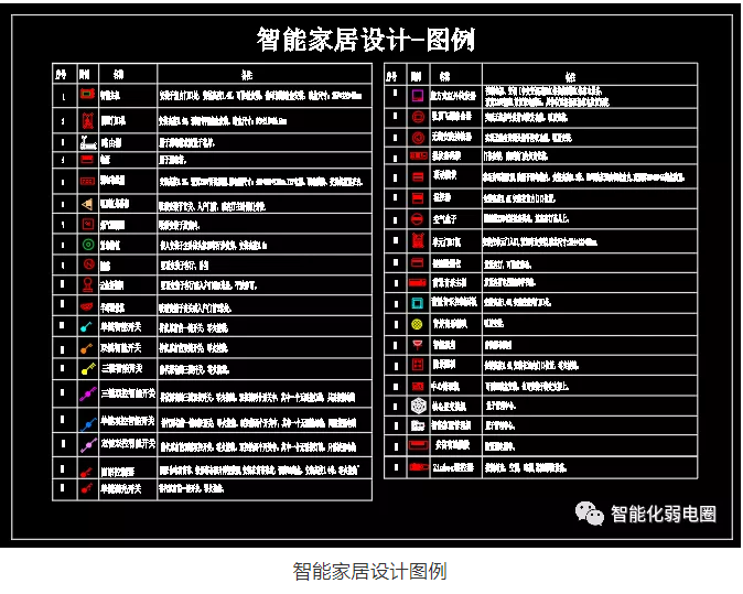 智能家居弱電設計圖標主要有路由器,別墅門口機,智能主機,電源,煙感,云臺攝像機,緊急按鈕等組成。