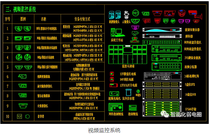 視頻監控系統是智能化l弱電系統最常用的系統之一,整套系統包括前端攝像頭,線纜,交換機,存儲,解碼,大屏等設備組成,視頻監控系統涉及到的弱電設計圖標主要有半球攝像機,球機,槍機,全景攝像頭,高考拋物攝頭,NVR,IPSAN,矩陣,流媒體服務器,解碼器,電腦終端,開關電源等等。