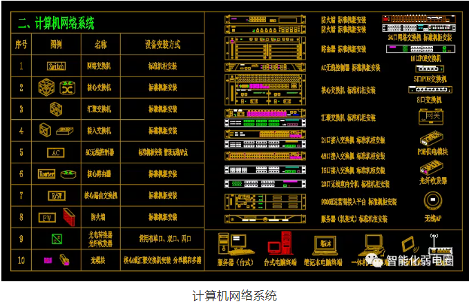 在弱電工程師勘測現場結束后,需要在原先設計院的CAD圖紙重新進行深化設計,圖紙上會修改設備類型,安裝方式,線纜走向及設備圖標。下面重點介紹弱電行業常用的智能化弱電設計圖標。