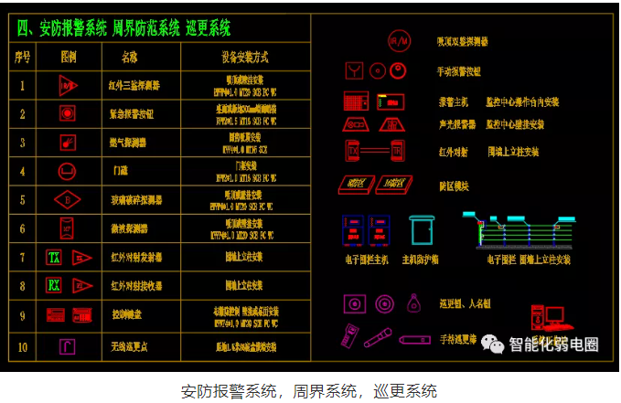 安防報警、周界防范、巡更系統弱電設計圖標主要有紅外探測器,緊急報警按鈕,燃氣探測器,門磁,紅外對射,無線巡更點等等。