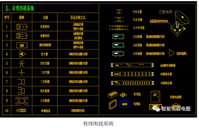 有線電視系統弱電設計圖標主要有光發射機,光接收機,放大器,分支器,分配器等組成。