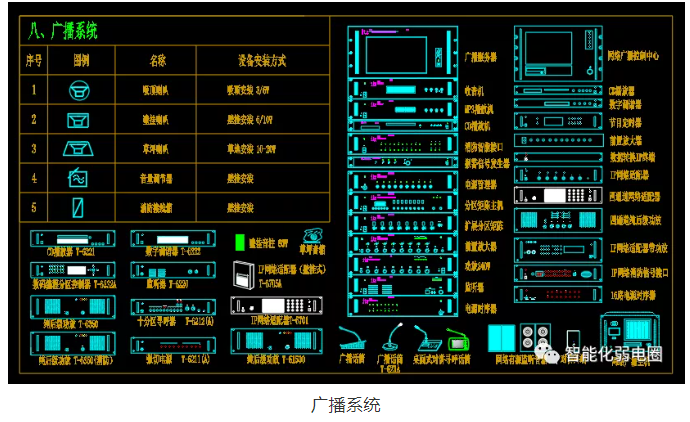 廣播系統弱電設計圖標主要包括吸頂喇叭,網絡廣播服務器,節目定時器,功放,音柱等組成。