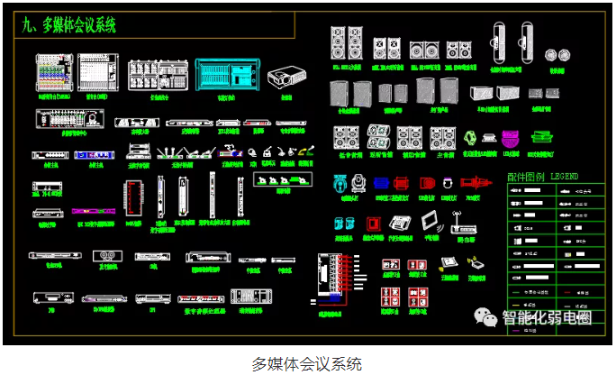 多媒體會議系統弱電設計圖標主要調音臺,燈光調光臺,投影機,功率放大器,專業音頻播放器,會議主機,無線手持話筒等組成。