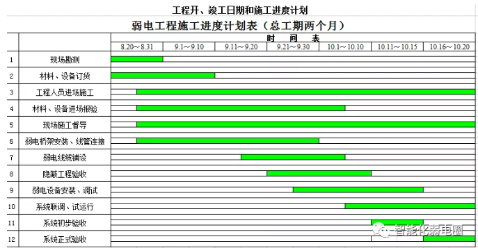 施工進度階段劃分:會描述弱電項目的總工期,以及項目需要分為多個階段進行,比如施工準備、技術交底、安全培訓階段,穿線、配管階段,設備安裝階段,系統調試、試運行及整改階段,以及人員培訓、竣工驗收等階段。