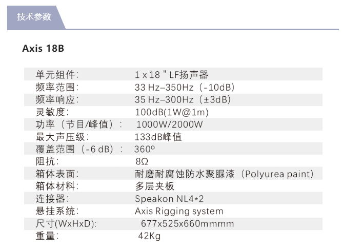 Axis18B采用1只18" 特別定制的(3"v.c.)低音單元,箱體直射倒相式箱體結(jié)構(gòu)設(shè)計(jì),吊掛系統(tǒng)采用鋁合金材質(zhì),與Axis20V組合,可吊掛、可堆疊,用以提升系統(tǒng)低頻表現(xiàn),箱體采用18mm樺木膠合板制成,涂有耐磨耐腐蝕的防水聚脲涂層。Axis18B能將整個系統(tǒng)的頻率范圍擴(kuò)展到35Hz。