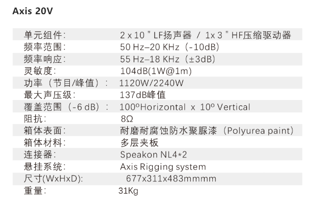 2x10"低音揚(yáng)聲器(3"v.c.)提供擴(kuò)展低頻再現(xiàn),與安裝在專門設(shè)計(jì)的波導(dǎo)管上的一個高頻壓縮驅(qū)動器(3"v.c.)相互作用。這種對稱聲學(xué)設(shè)計(jì)產(chǎn)生了最精確的瞬態(tài)再現(xiàn),使Axis20V能夠提供最細(xì)致和均勻的音頻性能。