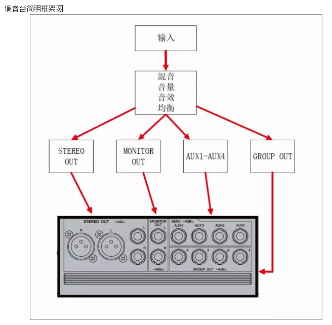 調(diào)音臺的主要功能是:把各種輸入的音頻信號在調(diào)音臺內(nèi)部進行混音和細調(diào),然后在輸出接口輸出經(jīng)過調(diào)整的音頻信號。