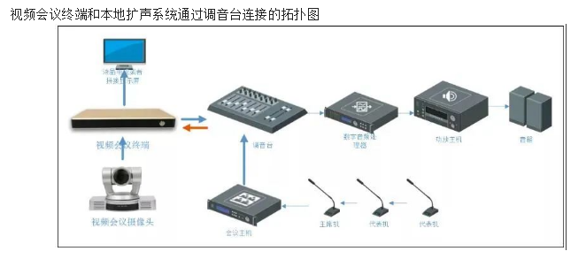 在連接視頻會議和本地話筒的時候,要把視頻會議終端的音頻輸出口連接到調(diào)音臺上去。然后本地話筒的信號經(jīng)過調(diào)音臺后,通過編組輸出到編組接口,然后再把調(diào)音臺的編組輸出,連接到視頻會議終端的音頻輸入接口。或者有時候為了消除回聲,要把話筒的編組輸出到數(shù)字音頻處理器,然后從音頻處理器再連接到視頻會議終端的音頻輸入接口。