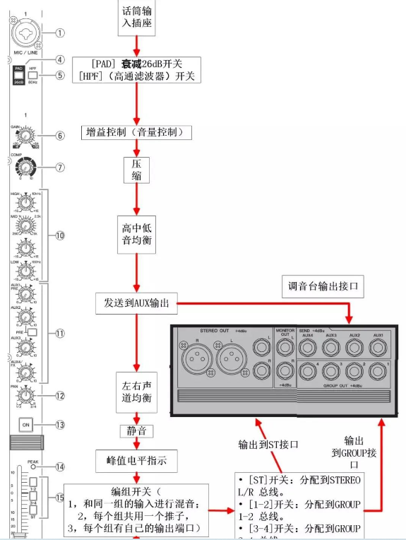 細分的話包括輸入部分:單聲道輸入、立體聲輸入、效果返回輸入和TALKBACK(對講)。輸出部分:立體聲主輸出(STEREO OUT,通常的MIX)、編組輸出(GROUP OUT)、輔助輸出(AUX1 – 4)、矩陣輸出、監(jiān)聽輸出(MONITOR OUT)等。