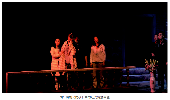 舞臺(tái)燈光中不僅光色有著無可比擬的情感力量,光影也有著獨(dú)特的語匯,它可以揭示人物內(nèi)心的矛盾世界,心理陰暗的一面就像影子一樣纏繞著、撕裂著。話劇《雨夜》中,副市長杜海獨(dú)白的一段,就用腳光做了影子的語匯處理,把他貪楚、以權(quán)謀私不能自拔的罪惡心理表現(xiàn)得淋漓盡致。隨著杜海的獨(dú)白“都他媽在一個(gè)規(guī)則里游戲”,腳光慢慢開啟,其他光慢慢壓暗,“我另玩一套玩得下去嗎?別人和你玩嗎?我不是沒高尚過沒純潔過,剛到機(jī)關(guān)的時(shí)候,我都發(fā)過誓,不管別人怎么樣,不管這社會(huì)什么樣,我要守住我自己的底線,一輩子干干凈凈做人,可根本守不??!……