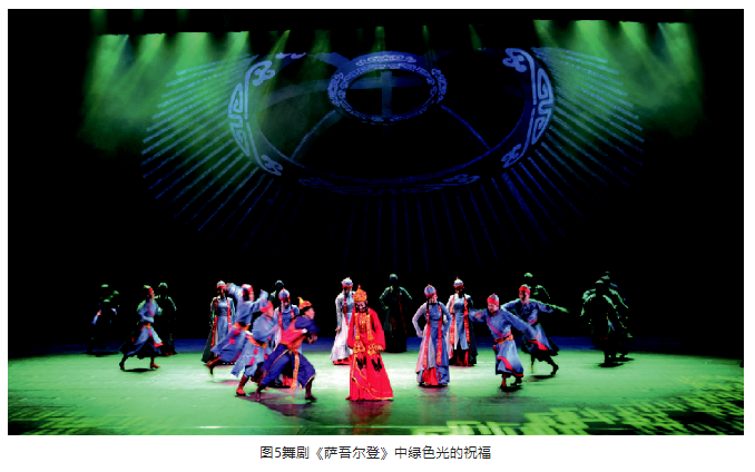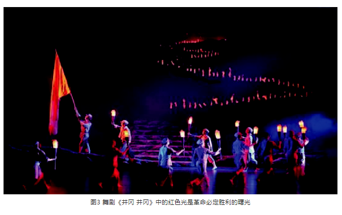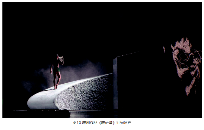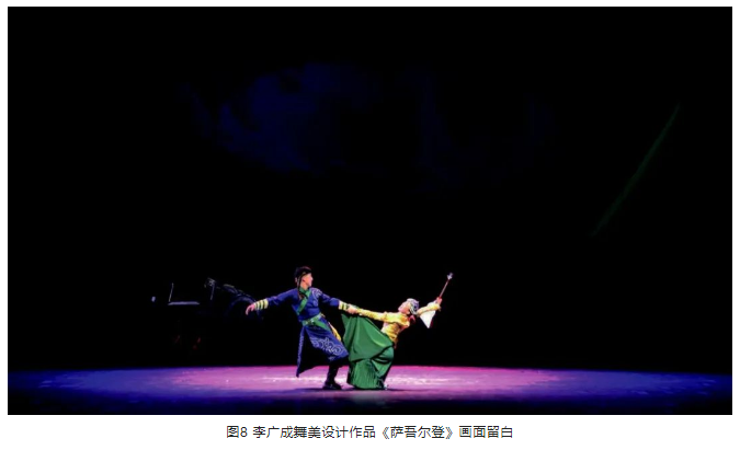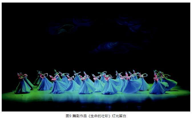 另外,在光位的選擇上,盡量選擇側(cè)光位,側(cè)光位的光束要較逆光弱一些。光區(qū)的邊界在沒有特殊要求的情況下,盡量以柔光斑虛化處理,避免硬光斑的清晰邊界。燈光色調(diào)要與舞美統(tǒng)一,表演空間光比關(guān)系層次分明、把握準(zhǔn)確。特別是景光,在舞美沒有給畫面“留白”的情況下,有的景片可以作無光處理,用不給光來實(shí)現(xiàn)舞臺(tái)畫面“留白”,這樣才能保持畫面的完整性。見圖9、圖10。