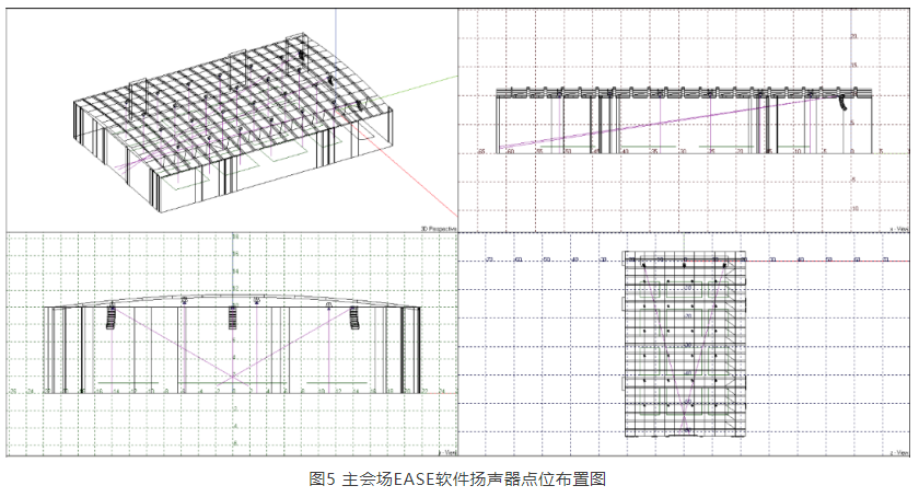為驗(yàn)證擴(kuò)聲系統(tǒng)可行性,筆者對(duì)主會(huì)場做了EASE聲場模擬,如圖4、圖5、圖6所示,滿足設(shè)計(jì)目標(biāo)。